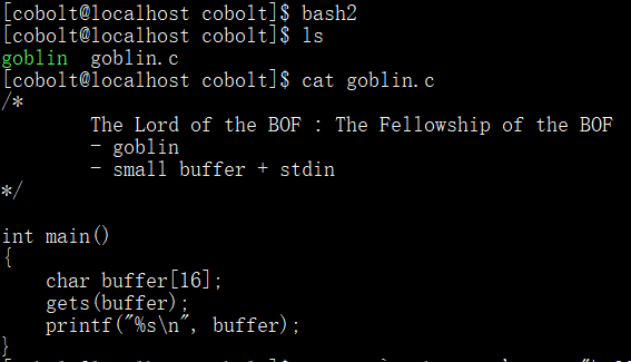 goblin.c 파일을 보면 저번과 비슷한 문제지만 이번에는 gets함수로 문자열을 받아온다. 버퍼의 크기가 16바이트이기 때문에 이번에도 환경변수를 이용해 문제를 풀어볼 것이다.