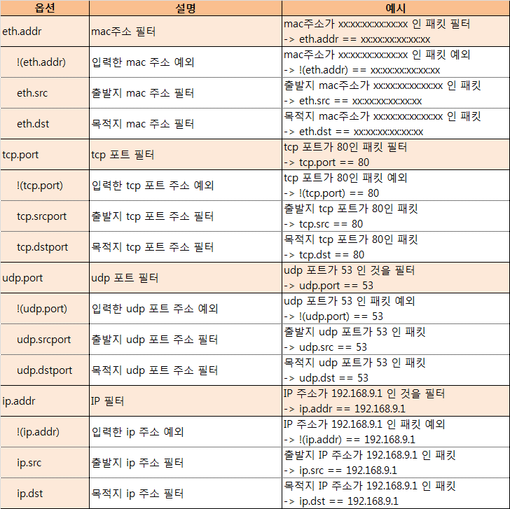 ip.src != 10.1.2.3 // 출발지 IP주소가 해당 IP주소가 아닌것 검색