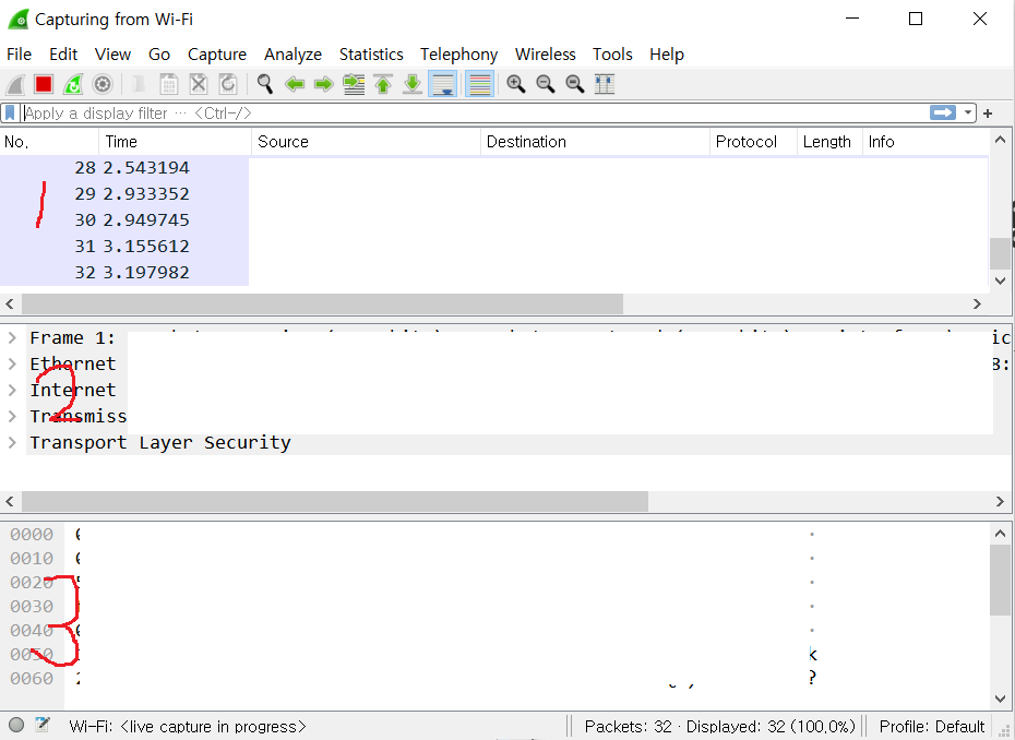 3) Packet Bytes : Packet List에서 선택한 하나의 단일 패킷에 대해 패킷 데이터를 16진수와 ASCII 코드로 보여준다.