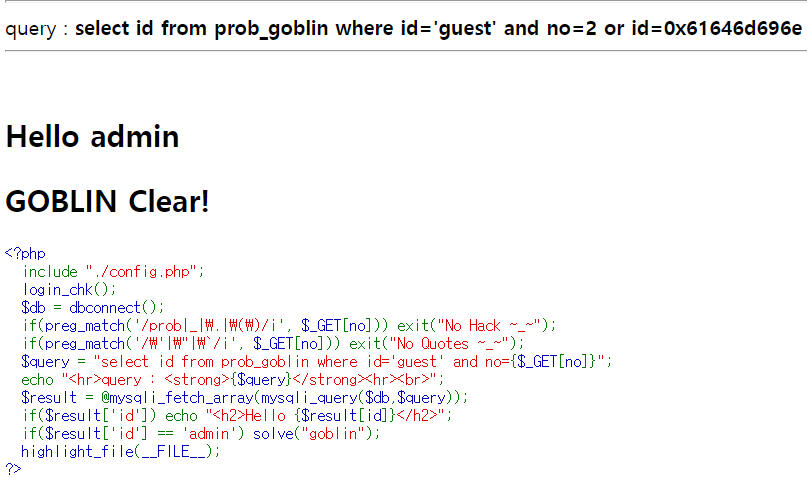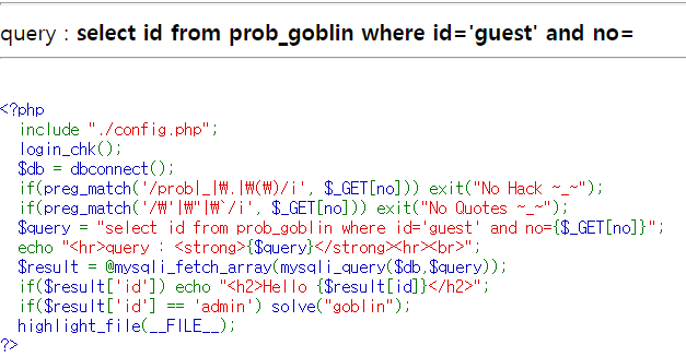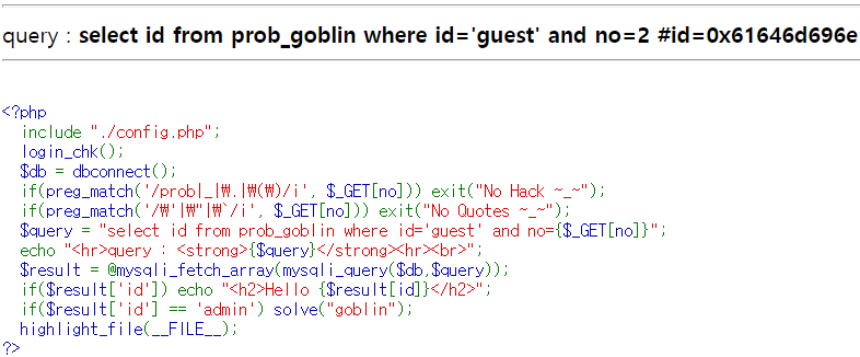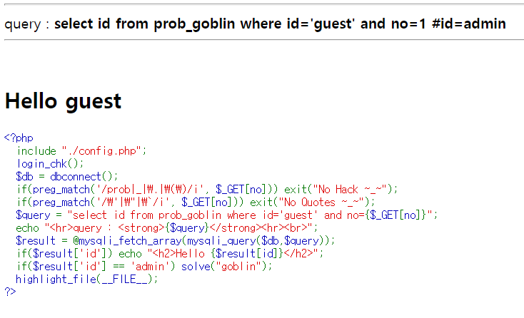 no에 아무거나 입력하고 뒤에 주석으로 id=admin을 날려보았더니 Hello guest를 띄웠다.
