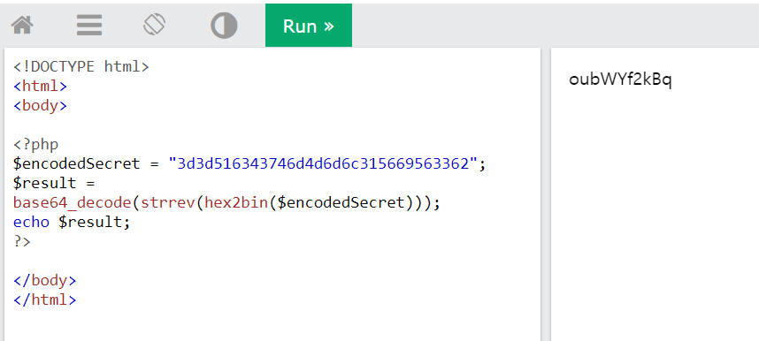php 온라인 컴파일러에서 함수를 반대로 사용해줬더니 oubWYf2kBq값이 나왔다.