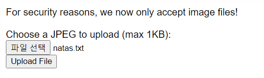 저번문제와 비슷하게 파일을 올릴 수 있다. 이번에는 txt파일을 올려도 File is not an image라는 문구가 뜨며 업로드 되지 않는다.