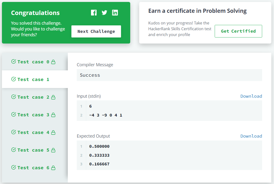 printf("%lf\n%lf\n%lf", (double)p/arr_count, (double)m/arr_count, (double)z/arr_count);