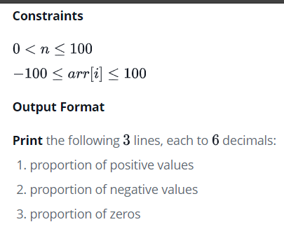 void plusMinus(int arr_count, int* arr) {