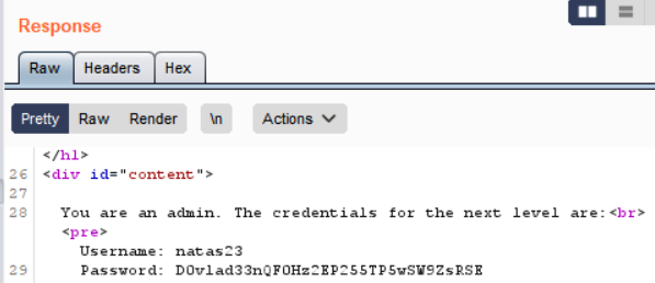 print "You are an admin. The credentials for the next level are:<br>";