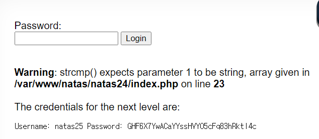 echo "<pre>Username: natas25 Password: <censored></pre>";