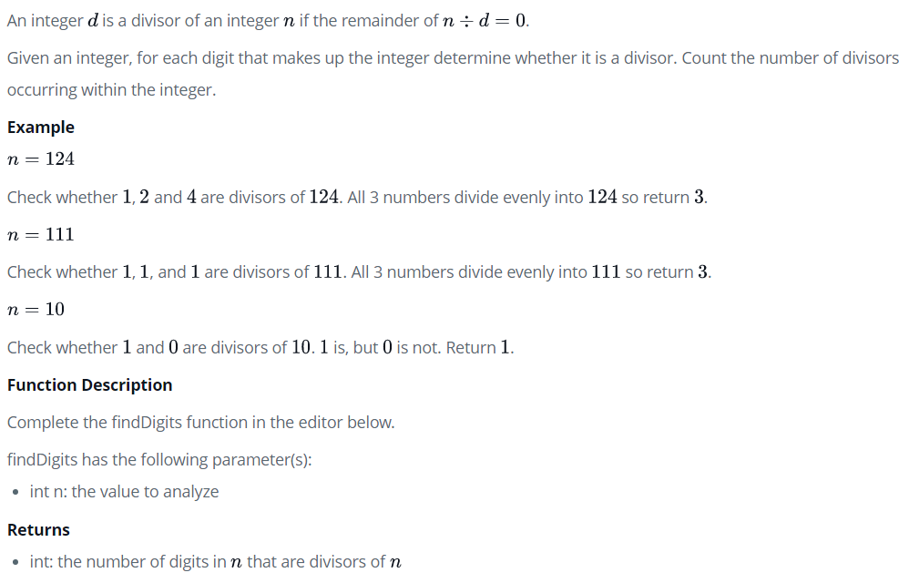 n이라는 int 범위 안의 수가 들어오고, n을 n의 자릿수로 나눴을 때 나머지가 0인 개수를 리턴하면 된다.
