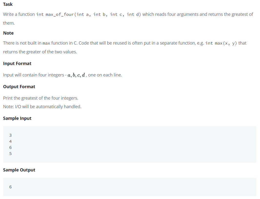 main함수는 채워져있고 max_of_four 함수만 만들면 되는데, 솔직히 효율적인지는 모르겠다.