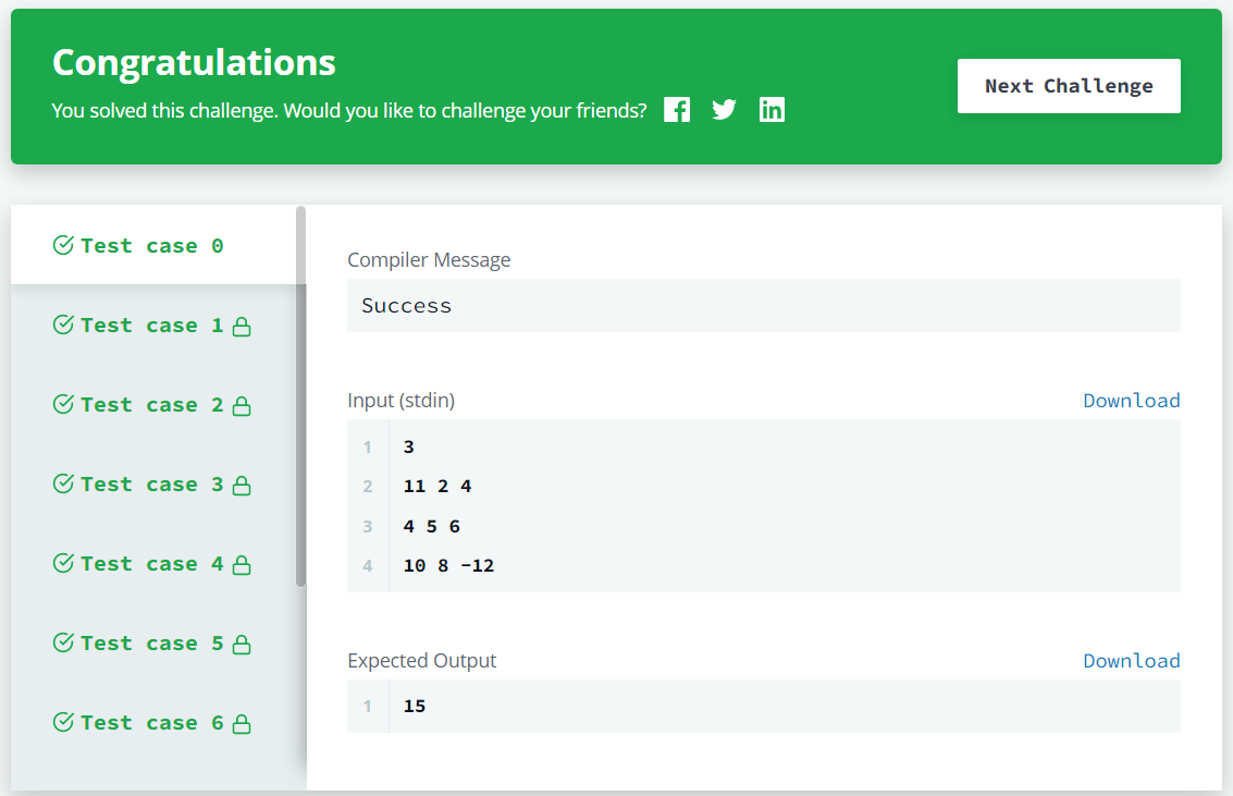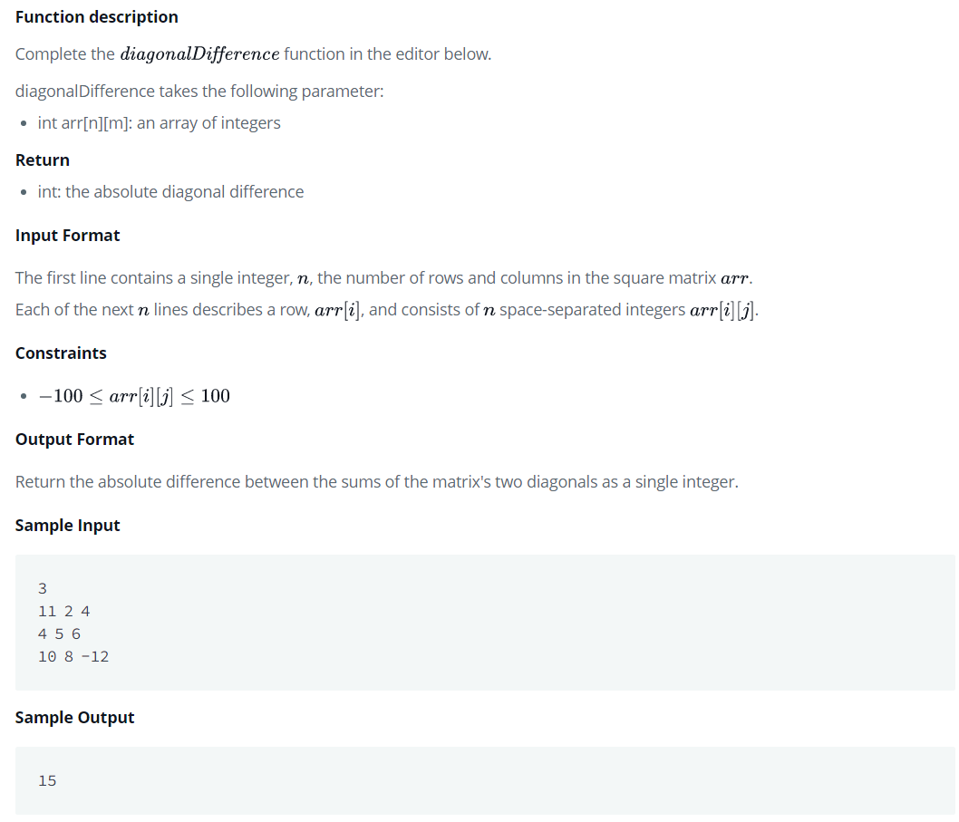 NxN크기의 배열이 입력되면 대각선 방향으로 원소들을 더한다. 두 값의 차를 맞추는 문제다.
