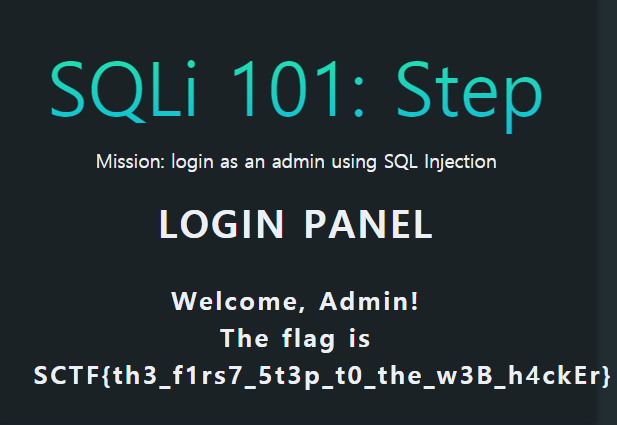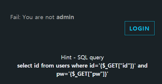 admin으로 로그인해야 함을 알 수 있고, 힌트로 query를 보여주고 있다.