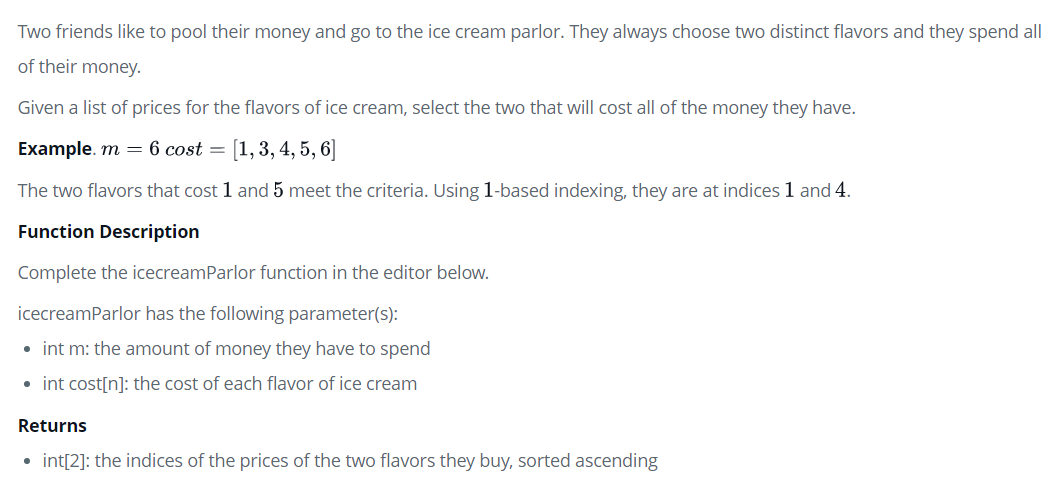 아이스크림 가격이 들어 있는 배열에서 두 가지 다른 맛을 골라 m의 가격에 맞추면 된다.