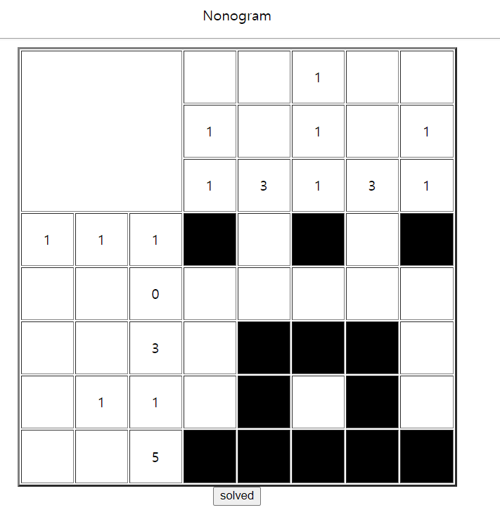 노노그램이라는 게임이 화면에 뜬다. 노노그램은 숫자에 맞게 색칠하는 퍼즐 게임인데 숫자가 여러 개면 사이에 공백이 한 칸 이상 있다는 뜻이다. 칸을 클릭해보니 색칠이 되었다.