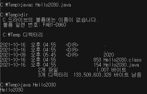 javac Hello2030.java를 입력해 컴파일하고 dir을 입력해 class파일이 생겼는지 확인했다.
