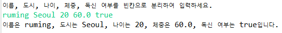 System.out.println("이름, 도시, 나이, 체중, 독신 여부를 빈칸으로 분리하여 입력하세요.");