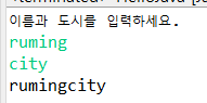 System.out.println("이름과 도시를 입력하세요.");