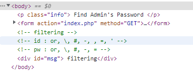 필터링 되는 문자는 소스 코드에 힌트로 나와있습니다.