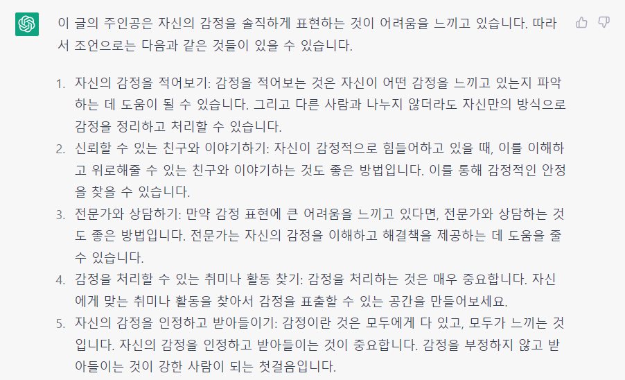 내 일기를 주고 조언해달라고 하니까 주인공의 심리 상태를 분석해서 조언해줬다.