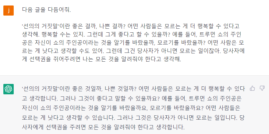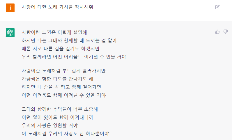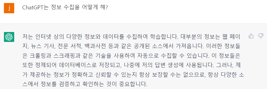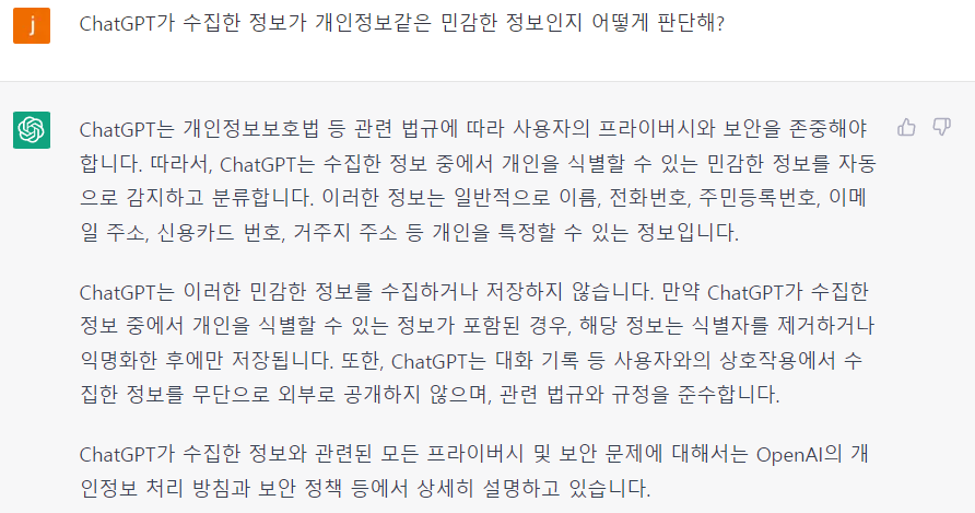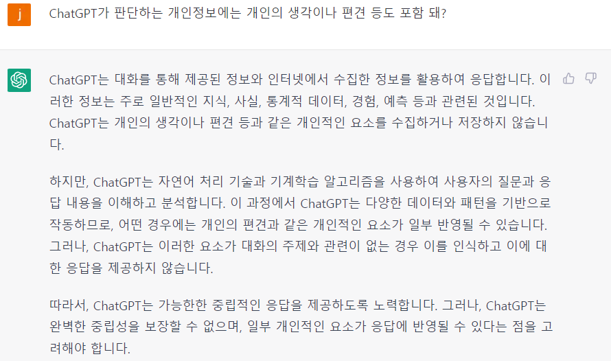 이런 기능은 글을 쓸 때 도움이 많이 될 것 같다. ChatGPT에 창작된 정보를 입력하면 수집만 되고 공개되지는 않으려나? 혹시 모르니 아직 공개되서는 안 되는 정보를 입력하는 것은 주의하는 게 좋을 것 같다.