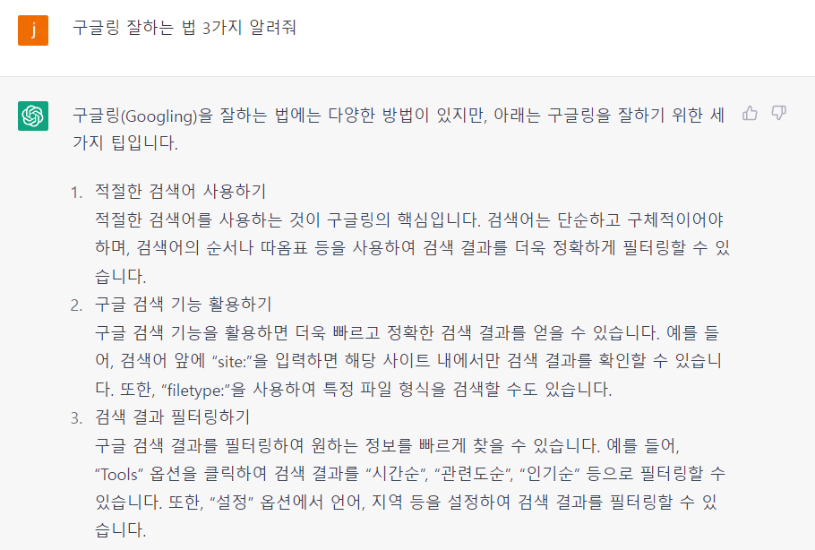 "구글링 잘하는 법 3가지 알려줘"라고 부탁하면 자료 조사에 더해 3가지로 요약까지 해준다. 위 질문은 구글링으로도 충분히 얻을 수 있지만, 아래처럼 사용하면 정리된 자료까지 얻을 수 있어 더 편리하다.