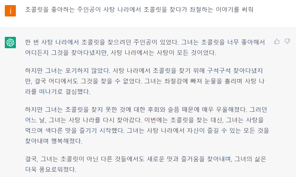 문장이 꽤 자연스럽다. 마지막이 해피엔딩인거나 내용이 동화의 형태를 띄는 것 같다. 구체적으로 부탁하면 더 좋은 결과를 줄지도?
