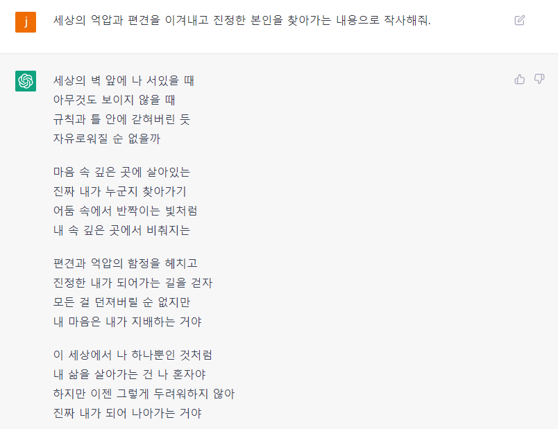 AI의 창작 과정은 잘 모르지만, 공개된 소스에서 정보를 가져오니 기존에 있던 글을 학습하고 그 형태에 따라 요구사항을 넣어주는 형태인 것 같다.