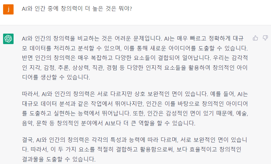 아마 AI에게 창의적인 사고를 요구해도 기존에 있던 것을 합치거나 변형한 수준일 것 같다. 완전한 창의력은 아직 인간이 우세할 지도 모른다.
