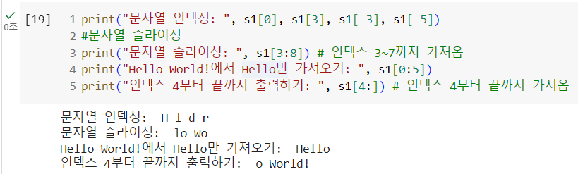 print("Hello World!에서 Hello만 가져오기: ", s1[0:5])