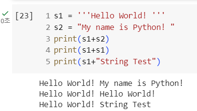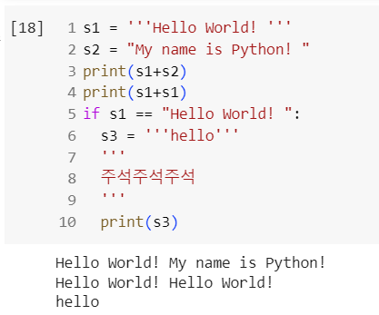 s1과 s3은 문자열로 처리, 7~9번째 줄은 주석으로 처리되었다.