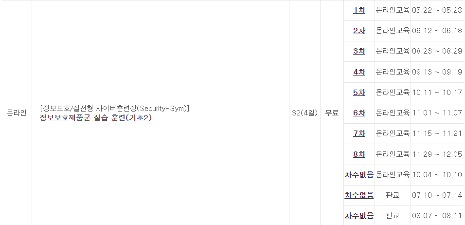 정보보호제품군 실습 훈련은 기초1, 기초2 과정이 있는데 기초1은 운영체제, 리눅스, 네트워크 같은 기초 과정이라 기초2를 신청했다.