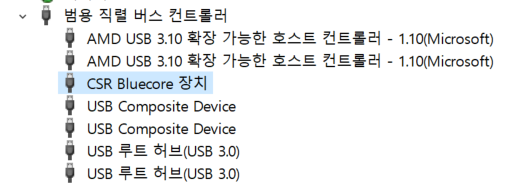 장치 관리자에서 제대로 인식되지 않던 블루투스 동글이 CSR Bluecore로 인식되었음