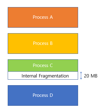 사용자 영역이 프로세스의 크기보다 커서 사용 공간이 남는 현상. Process C를 적재했을 때 20MB의 공간이 남음.