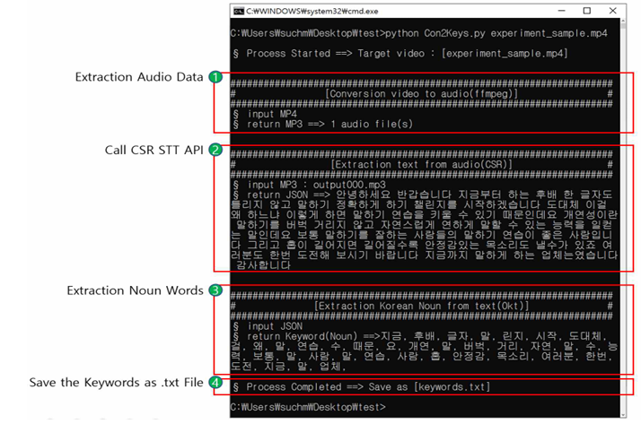 python 환경에서 ffmpeg, KoLNPy, CSR API를 이용하여 Con2Keys.py(Conversation to Keywords) POC 도구 개발