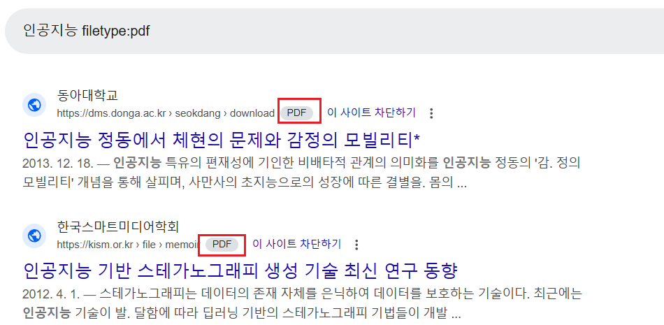 | filetype:pdf / ext:pdf | 입력한 파일 확장자 결과만 보여줌 (pdf나 ppt 파일만 검색하고 싶을 때) |