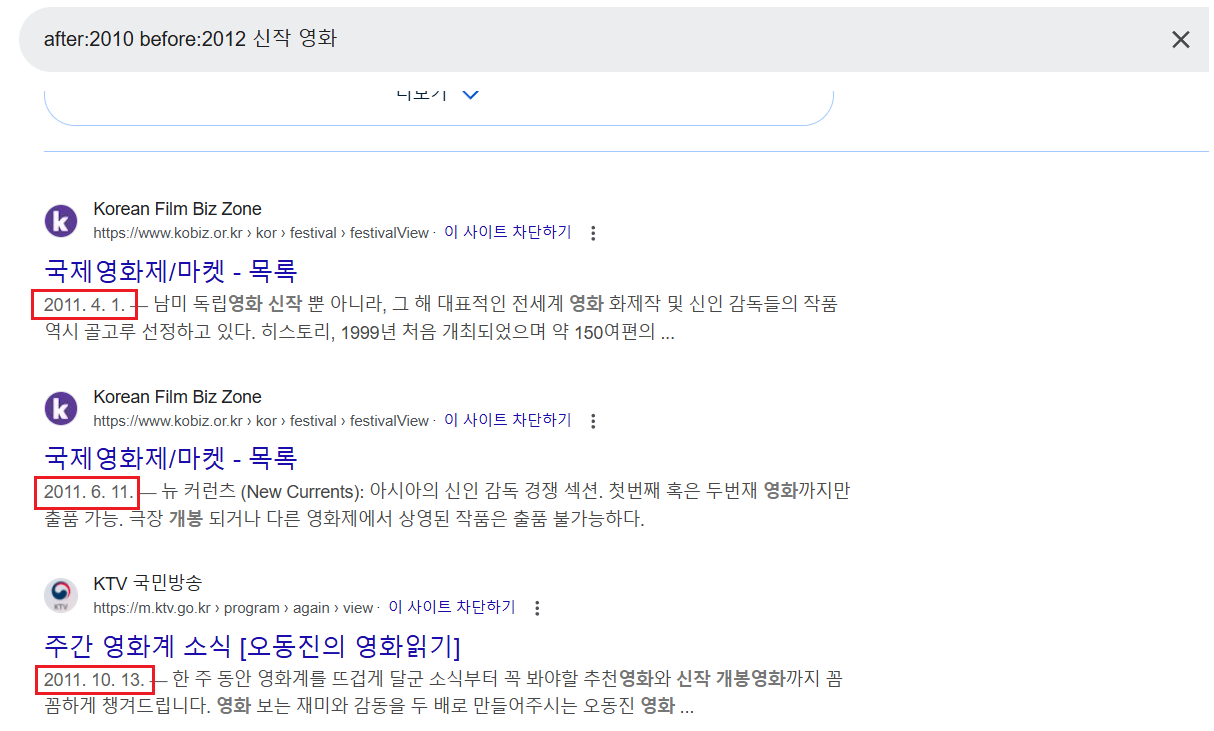 | after:YYYY-MM-DD, before:YYYY-MM-DD | after:특정 기간 이후, before:특정 기간 이전의 글을 검색. 두 개를 함께 사용할 경우 특정 기간 내의 글을 검색 가능. (before:YYYY after:YYYY) |