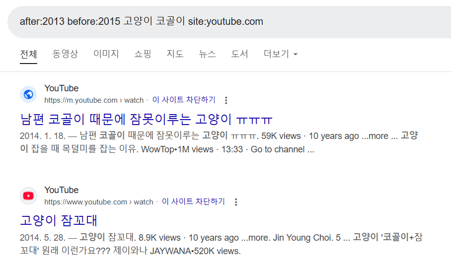 2013~2015년에 youtube에 업로드 된 고양이 코골이 영상을 검색할 때: