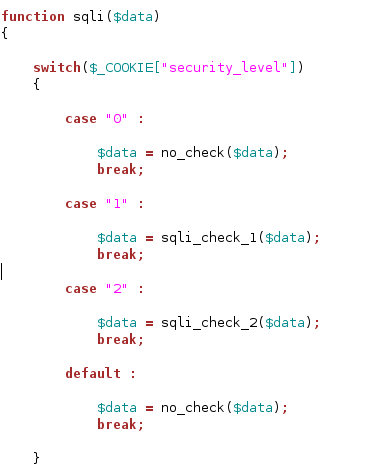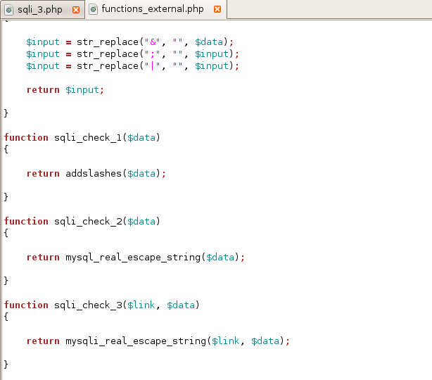 위 코드는 sqli_3.php에서 데이터를 처리하는 sqli함수 부분이다. 보면 난이도 중처럼 보이는 case "1"에서 sqli_check_1함수가 작동되고 있다. 이 함수는 functions_external.php 파일에 정의되어 있다.