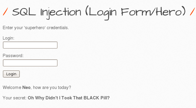 Q8. id, login, password 컬럼이 있음을 알아냈습니다. 이제는 neo 외의 다른 hero들의 secret을 알아낼 때입니다. 최소한 2명의 secret을 알아내세요.