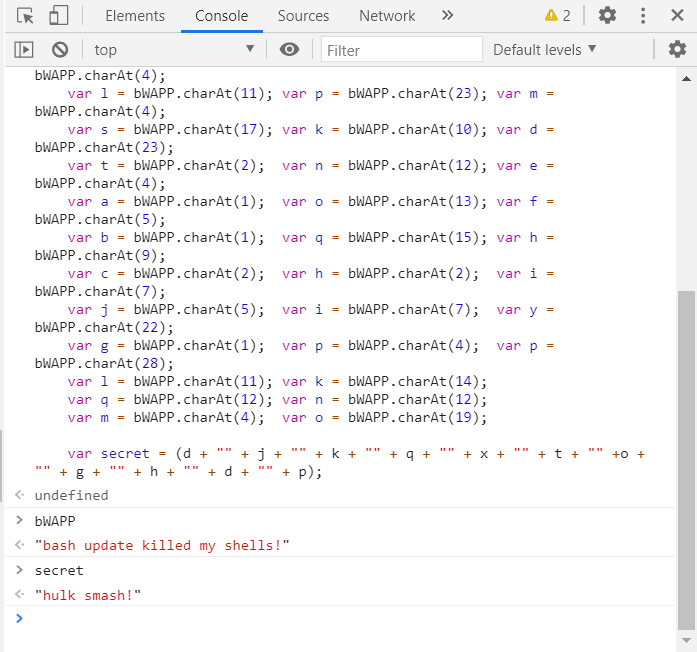 secret의 첫번째 변수 d 는 charAt(23) 이므로 (가장 마지막에 선언된 변수로 찾아야 함) bWAPP 문자열의 24번째 (0에서 시작하므로)를 보면 h이다.