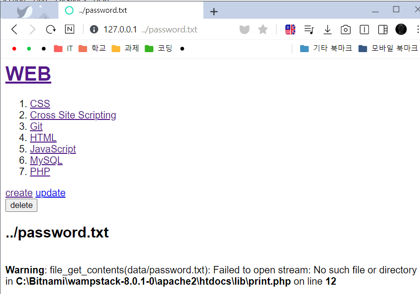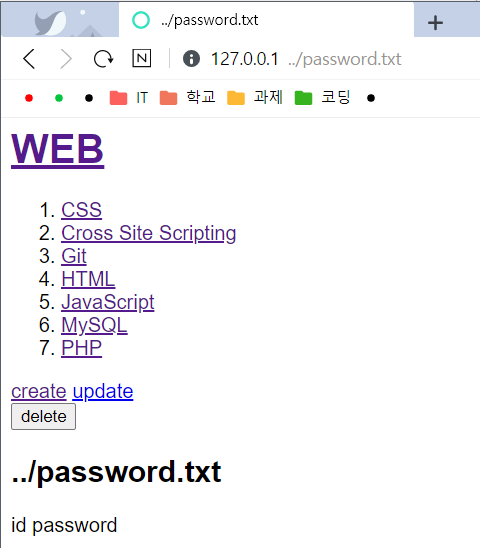 주소창에서 id 뒷부분을 ../password.txt로 바꿔주면 이 파일의 내용이 그대로 드러날 것이다.