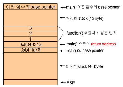 해커 지망자들이 알아야 할 Buffer Overflow Attack의 기초 4. 프로그램 구동 시 Segment에서는 어떤 일이? (p.12) simple.c void function(int a, int b, int c){ char buffer1[15]; char buffer2[10]; } void main(){ function(1, 2, 3); } 위는 스택을 이해하기 위해 만든 간단한 프로그램이다. $gcc -S -o simple.asm simple.c 로 컴파일 컴파일러의 버전에 따라 다르게 생성된다는 것을 알고 있어야 한다. 더보기 이 프로그램이 컴파일 되어 실제 메모리 상에 어느 위치에 존재하게 될지 알아보기 위해 컴파일을 한 다음 gdb를 이용해 어셈블리 코드와 메모리에 적재될 logical ..