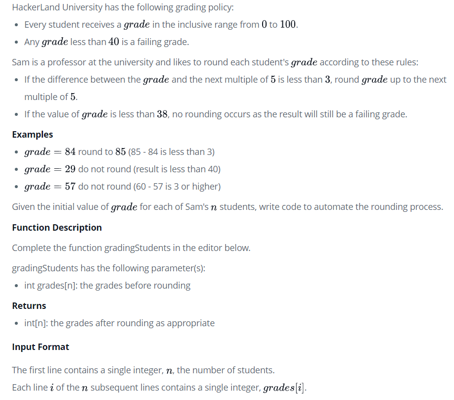 점수를 매기는 방법 40점 미만은 낙제다. 38점이상부터 반올림을 한다. 점수보다 높은 5의 배수와 3점 미만의 차이가 나면 반올림을 한다. 반올림 예) 38 -> 40, 58 -> 60 반올림 안하는 경우 : 55, 56, 77 코드 int* gradingStudents(int grades_count, int* grades, int* result_count) { int *a = malloc(grades_count*sizeof(int)); *result_count = grades_count; int i; for(i=0; i=38){ if((a[i]/5+1)*5-a[i]= 이어야되는데 착각했었다;; int* gradingStudents(int grades_count, int* grades, int* res..